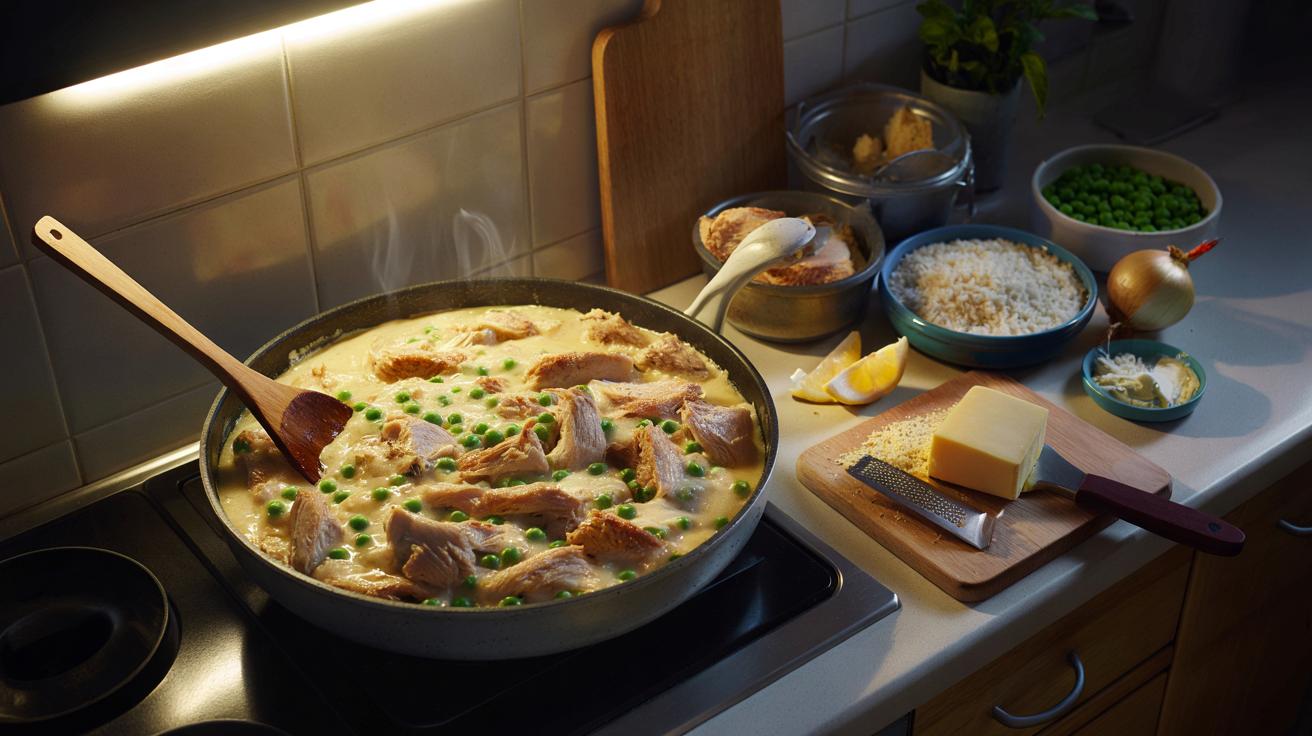 That night, staring at my leftovers, I didn’t follow a recipe. I followed my nose. I shredded the chicken, softened an onion, added rice, peas, a splash of cream, a little stock cube, a handful of grated cheese. Nothing fancy, nothing measured. Yet the pan started to look like something you’d proudly bring to the table.